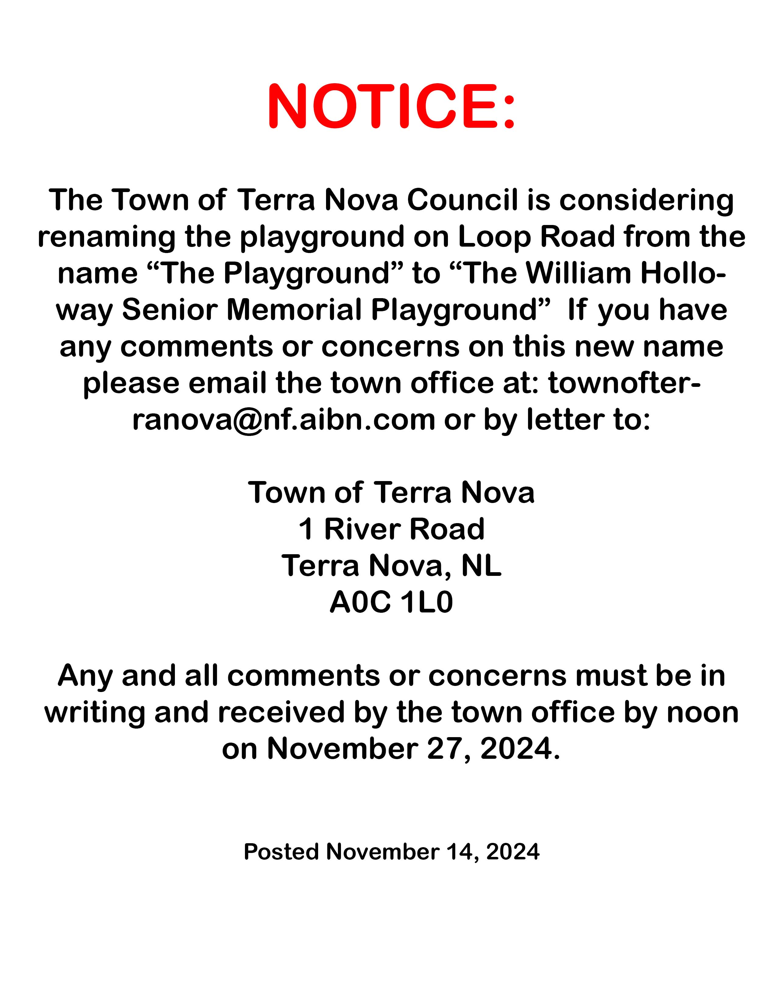 NOTICE: The Town of Terra Nova Council is considering renaming the playground on Loop Road from the name “The Playground” to “The William Holloway Senior Memorial Playground” Click for More